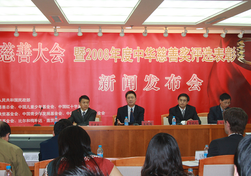 10月17日,“中华慈善大会暨2008年度中华慈善奖评选表彰”新闻发布会在北京召开。民政部社会福利和慈善事业促进司司长王振耀、民间组织管理局副局长贾晓九出席新闻发布会并回答记者提问。发布会由民政部新闻发言人、办公厅副主任俞建良主持。中华慈善总会、中国儿童少年基金会、中国红十字基金会、中国扶贫基金会、中国青少年发展基金会、中国残疾人福利基金会等六家5A级全国性基金会负责人,以及李嘉诚基金会、比尔及梅琳达?盖茨基金会、克林顿基金会等三家国际性基金会在华代表处负责人出席了新闻发布会。